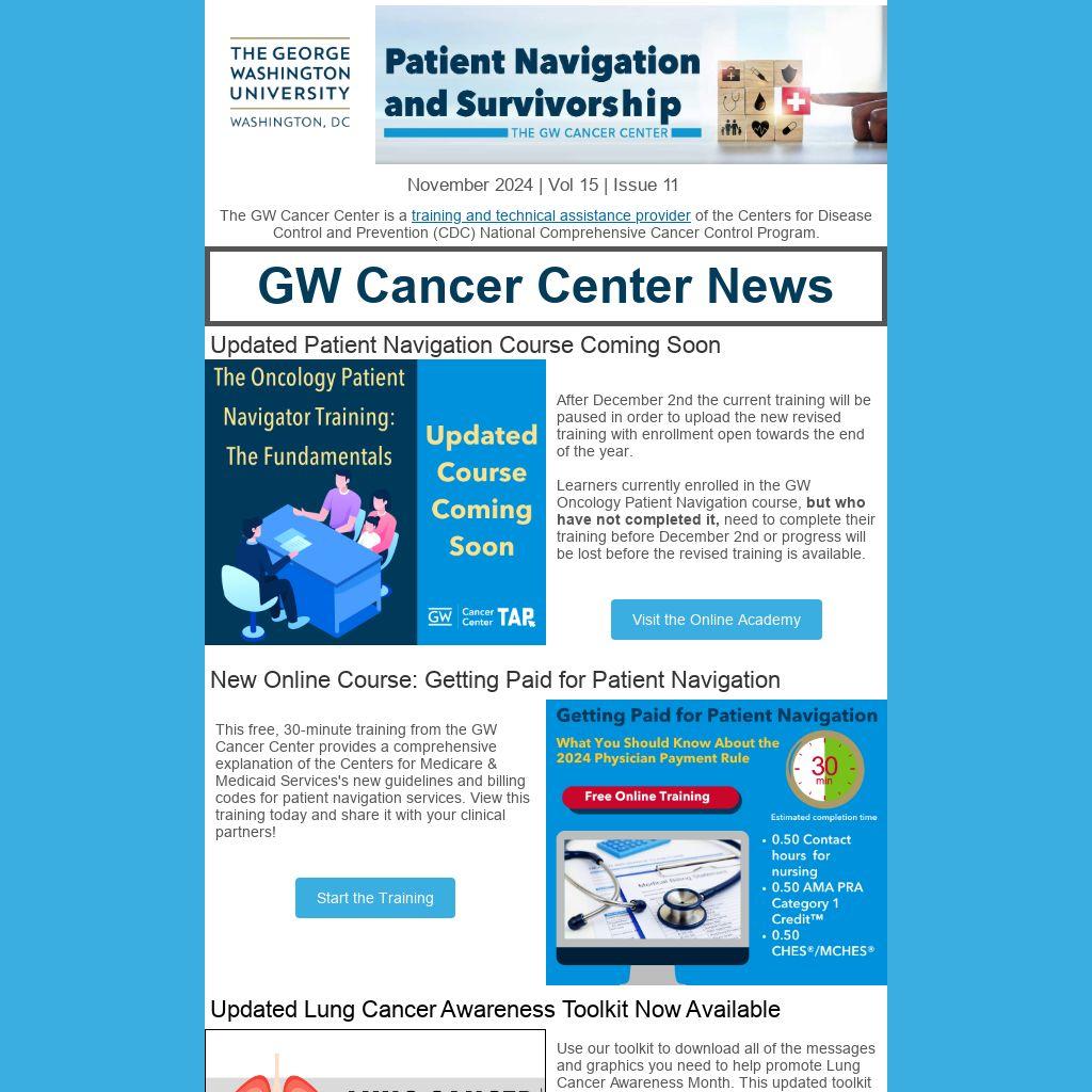 Learners currently enrolled in the GW Oncology Patient Navigation course, but who have not completed it, need to complete their training before December 2nd or progress will be lost before the revised training is available.