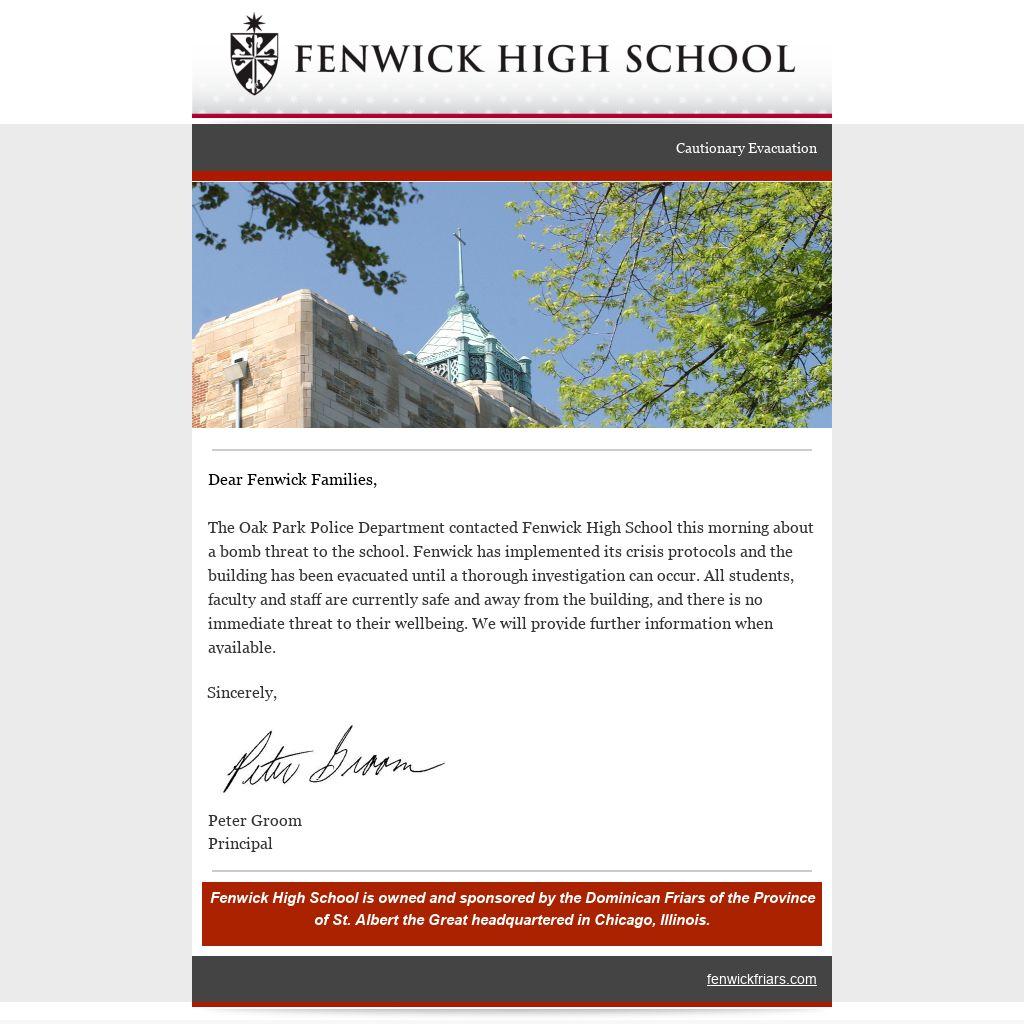 The Oak Park Police Department contacted Fenwick High School this morning about a bomb threat to the school. Fenwick has implemented its crisis protocols and the building has been evacuated until a thorough investigation can occur. All students, faculty and staff are currently safe and away from the building, and there is no immediate threat to their wellbeing. We will provide further information when available.