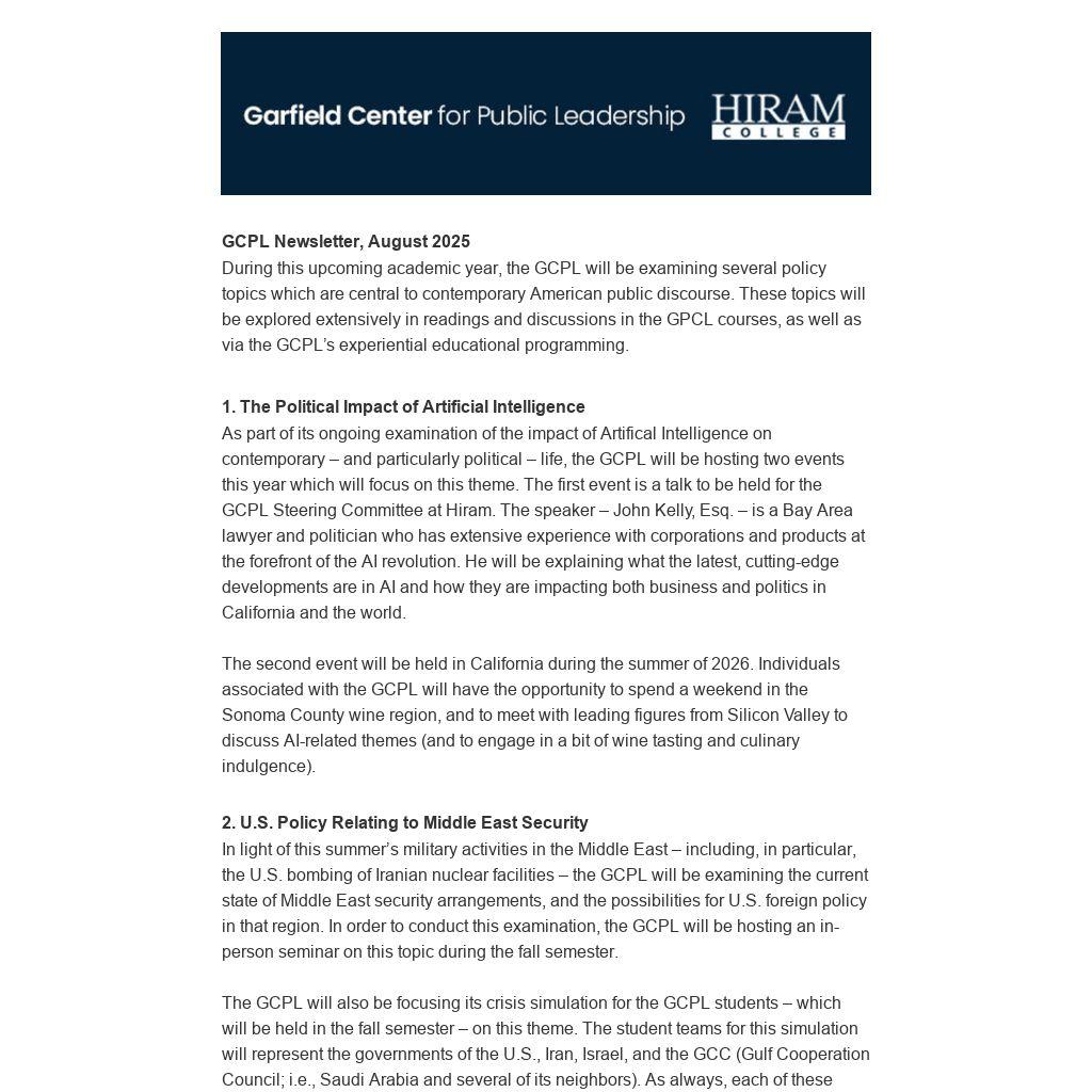 In light of this summer’s military activities in the Middle East – including, in particular, the U.S. bombing of Iranian nuclear facilities – the GCPL will be examining the current state of Middle East security arrangements, and the possibilities for U.S. foreign policy in that region. In order to conduct this examination, the GCPL will be hosting an in-person seminar on this topic during the fall semester.