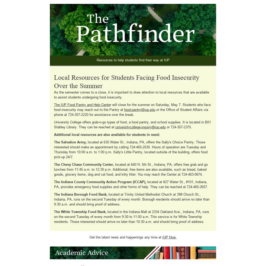 University College offers grab-n-go types of food, a food pantry, and school supplies. It is located in B01 Stabley Library. They can be reached at universitycollege-inquiry@iup.edu or 724-357-2375.