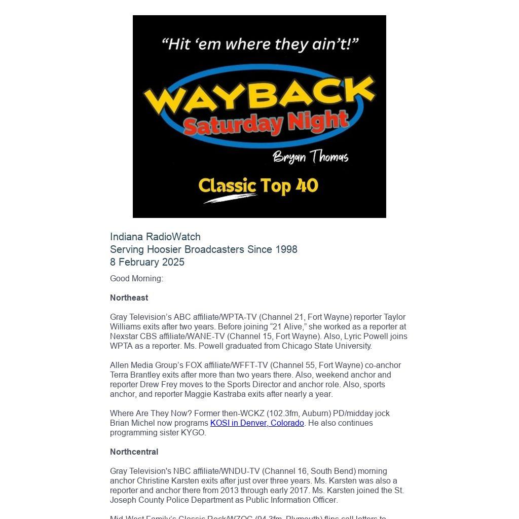 Indiana RadioWatch subscriptions are free. To subscribe, send an e-mail to irw@well.com and we'll add you. After publication, we archive Indiana RadioWatch on the Indiana Radio Archive at http://www.indianaradio.net. Please e-mail us your news stories and employment opportunities.