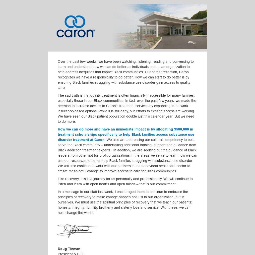 How we can do more and have an immediate impact is by allocating $500,000 in treatment scholarships specifically to help Black families access substance use disorder treatment at Caron. We also are addressing our cultural competency to best serve the Black community – undertaking additional training, support and guidance from Black addiction treatment experts. In addition, we are seeking out the guidance of Black leaders from other not-for-profit organizations in the areas we serve to learn how we can use our resources to better help Black families struggling with substance use disorder. We will also continue to work with our partners in the behavioral healthcare sector to create meaningful change to improve access to care for Black communities.