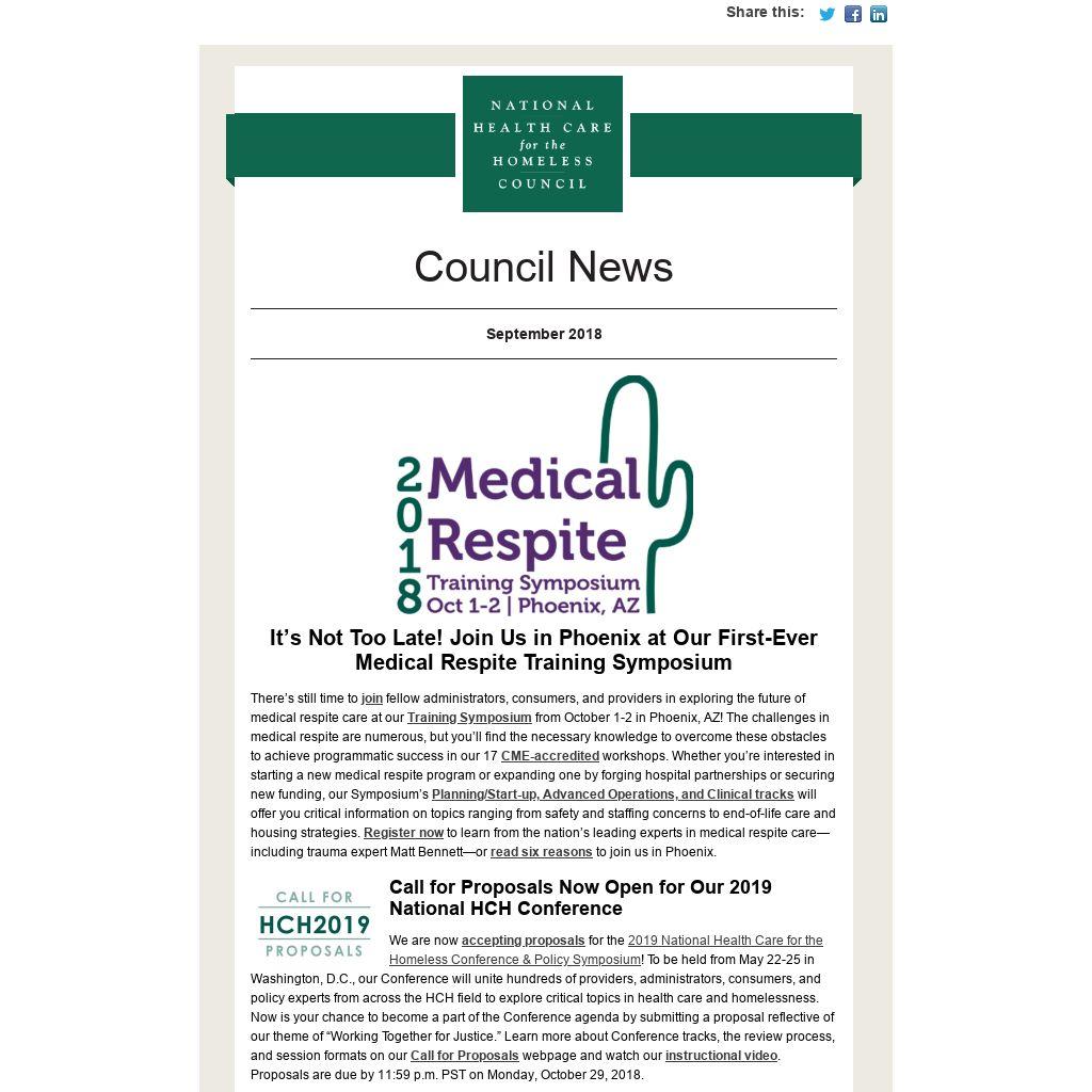 | Upcoming Webinar Spotlights Denver HCH’s Integrated Model of Care Join the Council and leaders from the Colorado Coalition for the Homeless (CCH) on Wednesday, September 26, from 2-3:30 p.m. EST to discuss housing and health care! Learn how CCH finances its capital housing development; how they plan, design, and manage multiple housing projects simultaneously; how they integrate housing and health care services; and how they include property management staff in a coordinated approach to care in our discussion. Complementing our recent policy brief, this free webinar is a great opportunity for you to learn how the Denver HCH program has become a national leader on the integration of housing and health care. Register now.