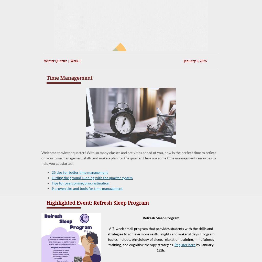 A 7-week email program that provides students with the skills and strategies to achieve more restful nights and wakeful days. Program topics include, physiology of sleep, relaxation training, mindfulness training, and cognitive therapy strategies. Register here by January 12th.