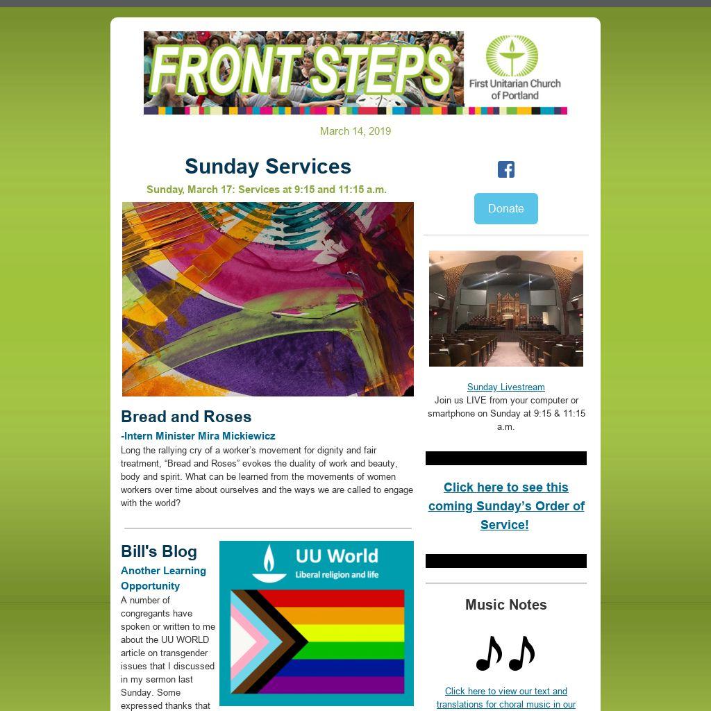 Do You Have an Item for E-news and/or the Sunday Bulletin?If you have an item you’d like published in our weekly Front Steps (eNews) or the Sunday Bulletin, please submit it to: