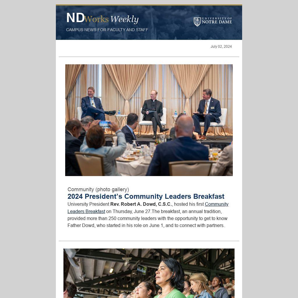 University President Rev. Robert A. Dowd, C.S.C., hosted his first Community Leaders Breakfast on Thursday, June 27.The breakfast, an annual tradition, provided more than 250 community leaders with the opportunity to get to know Father Dowd, who started in his role on June 1, and to connect with partners.