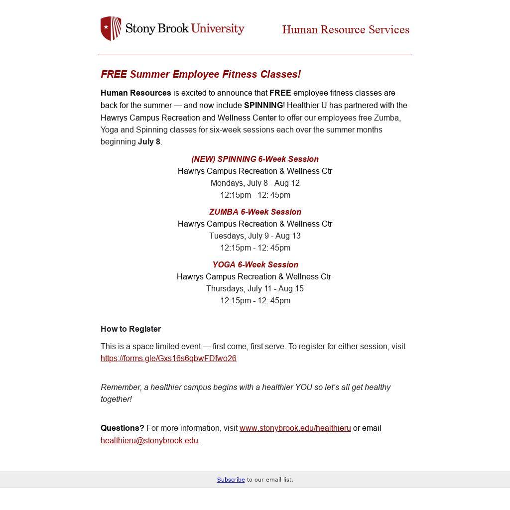 Human Resources is excited to announce that FREE employee fitness classes are back for the summer — and now include SPINNING! Healthier U has partnered with the Hawrys Campus Recreation and Wellness Center to offer our employees free Zumba, Yoga and Spinning classes for six-week sessions each over the summer months beginning July 8.