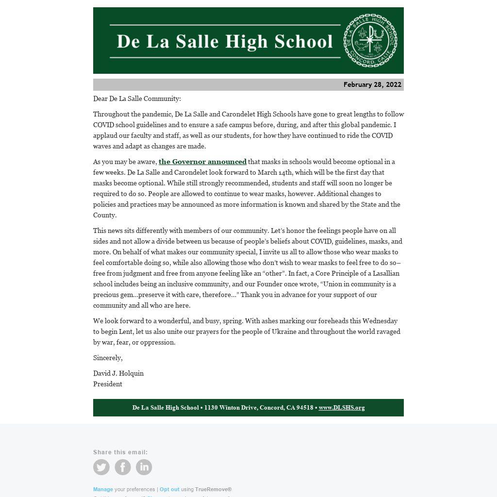 As you may be aware, the Governor announced that masks in schools would become optional in a few weeks. De La Salle and Carondelet look forward to March 14th, which will be the first day that masks become optional. While still strongly recommended, students and staff will soon no longer be required to do so. People are allowed to continue to wear masks, however. Additional changes to policies and practices may be announced as more information is known and shared by the State and the County.