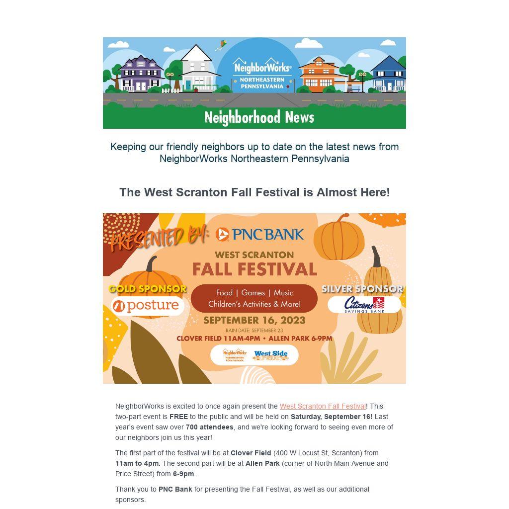 NeighborWorks is excited to once again present the West Scranton Fall Festival! This two-part event is FREE to the public and will be held on Saturday, September 16! Last year's event saw over 700 attendees, and we're looking forward to seeing even more of our neighbors join us this year!