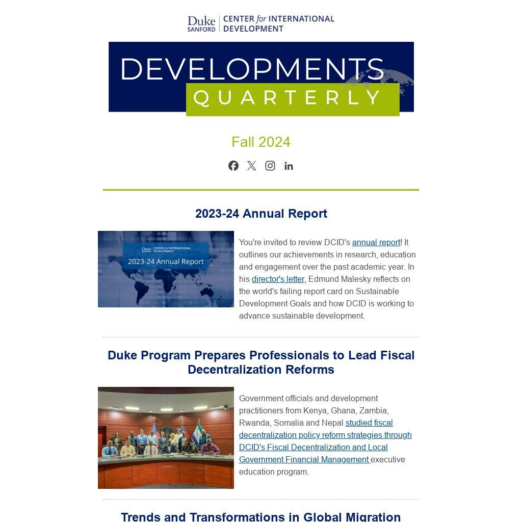 You're invited to review DCID's annual report! It outlines our achievements in research, education and engagement over the past academic year. In his director's letter, Edmund Malesky reflects on the world's failing report card on Sustainable Development Goals and how DCID is working to advance sustainable development.