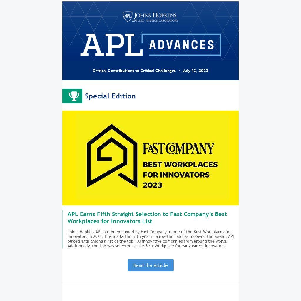 Johns Hopkins APL has been named by Fast Company as one of the Best Workplaces for Innovators in 2023. This marks the fifth year in a row the Lab has received the award. APL placed 17th among a list of the top 100 innovative companies from around the world. Additionally, the Lab was selected as the Best Workplace for early career innovators.