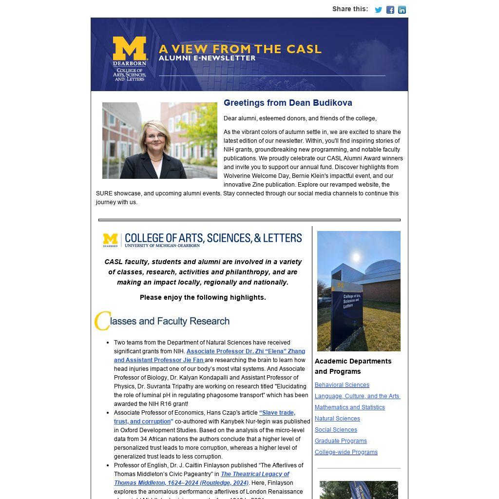 As the vibrant colors of autumn settle in, we are excited to share the latest edition of our newsletter. Within, you'll find inspiring stories of NIH grants, groundbreaking new programming, and notable faculty publications. We proudly celebrate our CASL Alumni Award winners and invite you to support our annual fund. Discover highlights from Wolverine Welcome Day, Bernie Klein's impactful event, and our innovative Zine publication. Explore our revamped website, the SURE showcase, and upcoming alumni events. Stay connected through our social media channels to continue this journey with us.