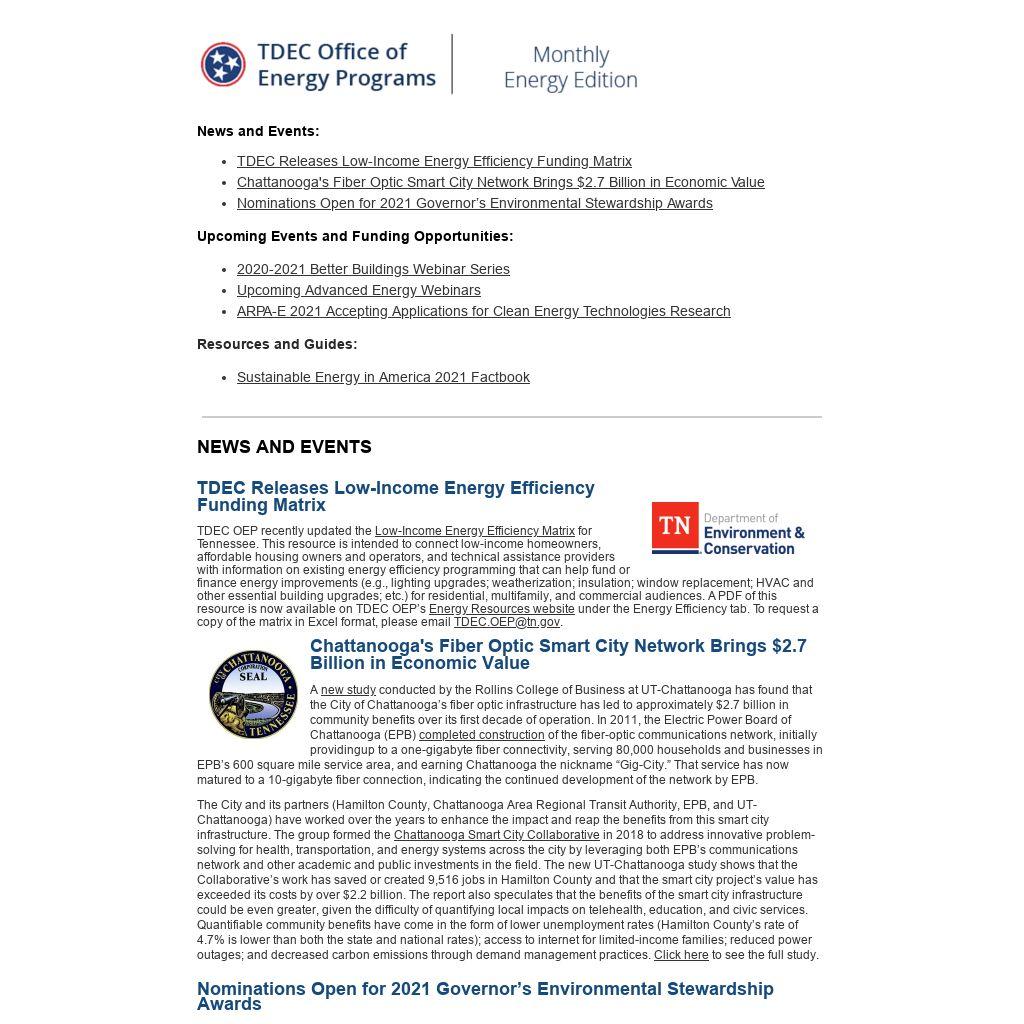 TDEC OEP recently updated the Low-Income Energy Efficiency Matrix for Tennessee. This resource is intended to connect low-income homeowners, affordable housing owners and operators, and technical assistance providers with information on existing energy efficiency programming that can help fund or finance energy improvements (e.g., lighting upgrades; weatherization; insulation; window replacement; HVAC and other essential building upgrades; etc.) for residential, multifamily, and commercial audiences. A PDF of this resource is now available on TDEC OEP’s Energy Resources website under the Energy Efficiency tab. To request a copy of the matrix in Excel format, please email TDEC.OEP@tn.gov.