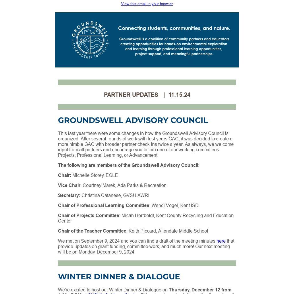 This last year there were some changes in how the Groundswell Advisory Council is organized. After several rounds of work with last years GAC, it was decided to create a more nimble GAC with broader partner check-ins twice a year. As always, we welcome input from all partners and encourage you to join one of our working committees: Projects, Professional Learning, or Advancement.