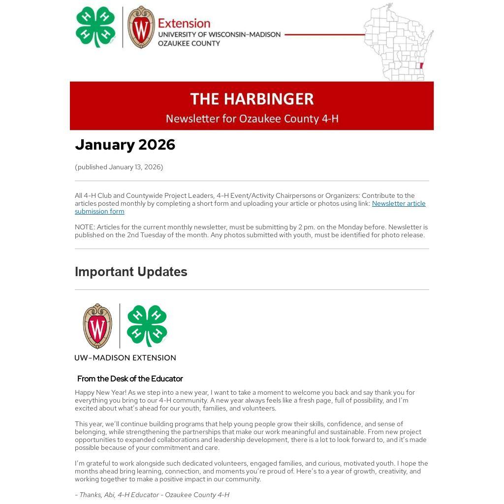 You are invited to attend the Ozaukee County 4-H Leaders Association meeting on January 15th from 7:30-9:00 pm at TJ Middle School Library in Port Washington.