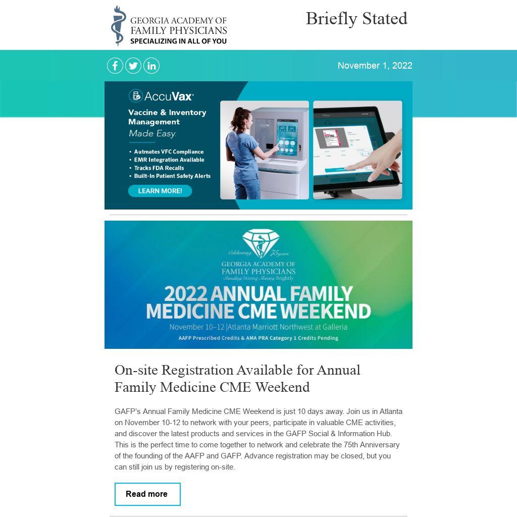 Copyright 2022 Georgia Academy of Family Physicians To ensure that e-mails from GAFP are delivered to your inbox, please add gafp@gafp.org to your address book or list of approved senders.