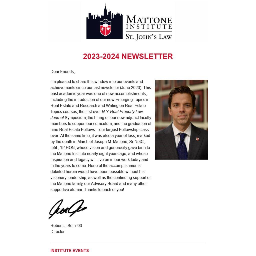 I’m pleased to share this window into our events and achievements since our last newsletter (June 2023). This past academic year was one of new accomplishments, including the introduction of our new Emerging Topics in Real Estate and Research and Writing on Real Estate Topics courses, the first-ever N.Y. Real Property Law Journal Symposium, the hiring of four new adjunct faculty members to support our curriculum, and the graduation of nine Real Estate Fellows – our largest Fellowship class ever. At the same time, it was also a year of loss, marked by the death in March of Joseph M. Mattone, Sr. ‘53C, ‘55L, ‘94HON, whose vision and generosity gave birth to the Mattone Institute nearly eight years ago, and whose inspiration and legacy will live on in our work today and in the years to come. None of the accomplishments detailed herein would have been possible without his visionary leadership, as well as the continuing support of the Mattone family, our Advisory Board and many other supportive alumni. Thanks to each of you!