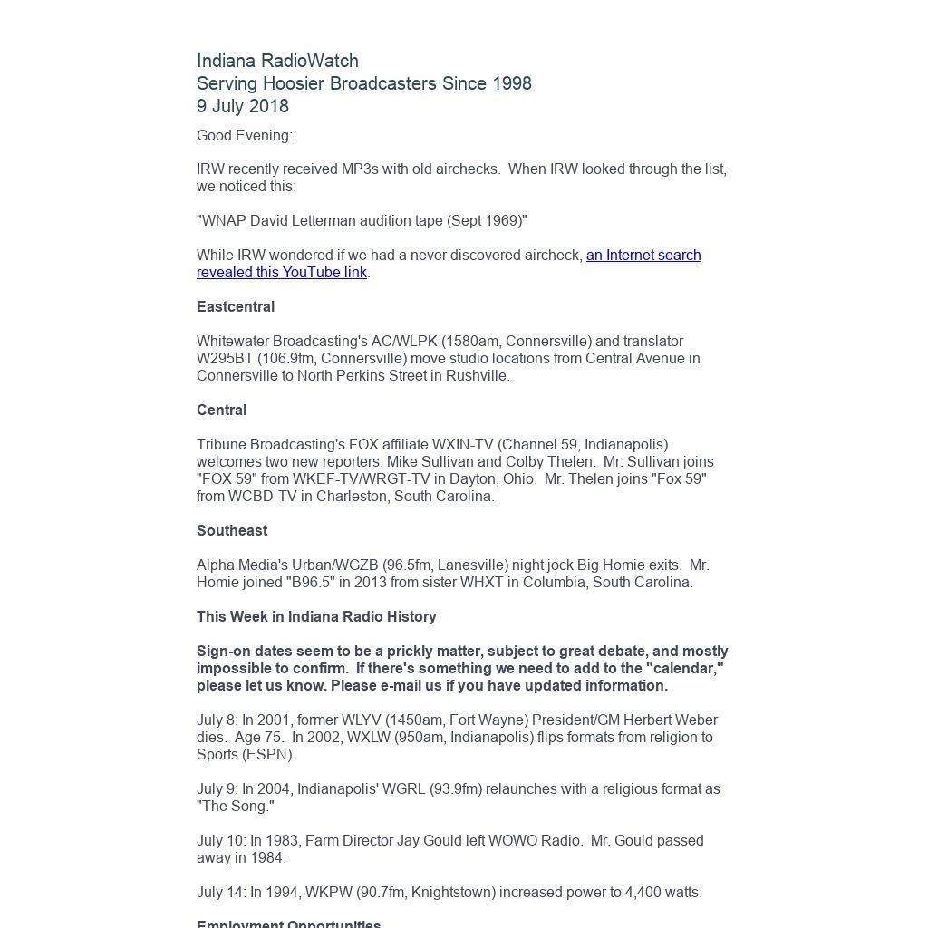 Indiana RadioWatch subscriptions are free. To subscribe, send an e-mail to irw@well.com and we'll add you. After publication, we archive Indiana RadioWatch on the Indiana Radio Archive at http://www.indianaradio.net. Please e-mail us your news stories and employment opportunities.
