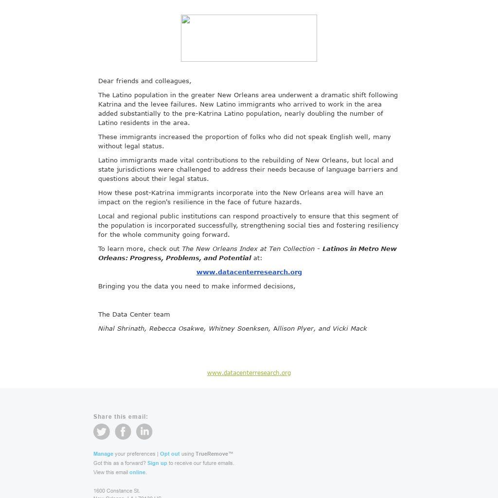 To learn more, check out The New Orleans Index at Ten Collection - Latinos in Metro New Orleans: Progress, Problems, and Potential at: