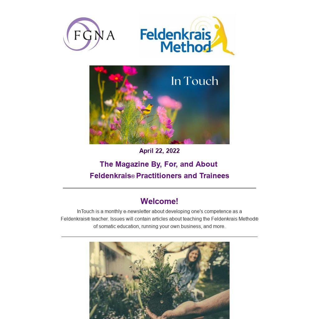 Welcome!InTouch is a monthly e-newsletter about developing one's competence as a Feldenkrais® teacher. Issues will contain articles about teaching the Feldenkrais Method® of somatic education, running your own business, and more.