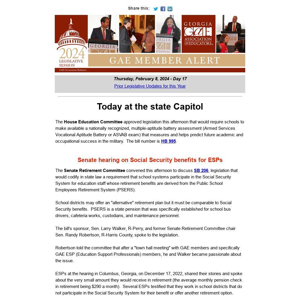 Join your colleagues and friends at the 2024 GAE Day at the Capitol on Thursday, February 22. Hear and meet from legislators who are influential in the adoption of education legislation and policy. Click on the photo below to register.