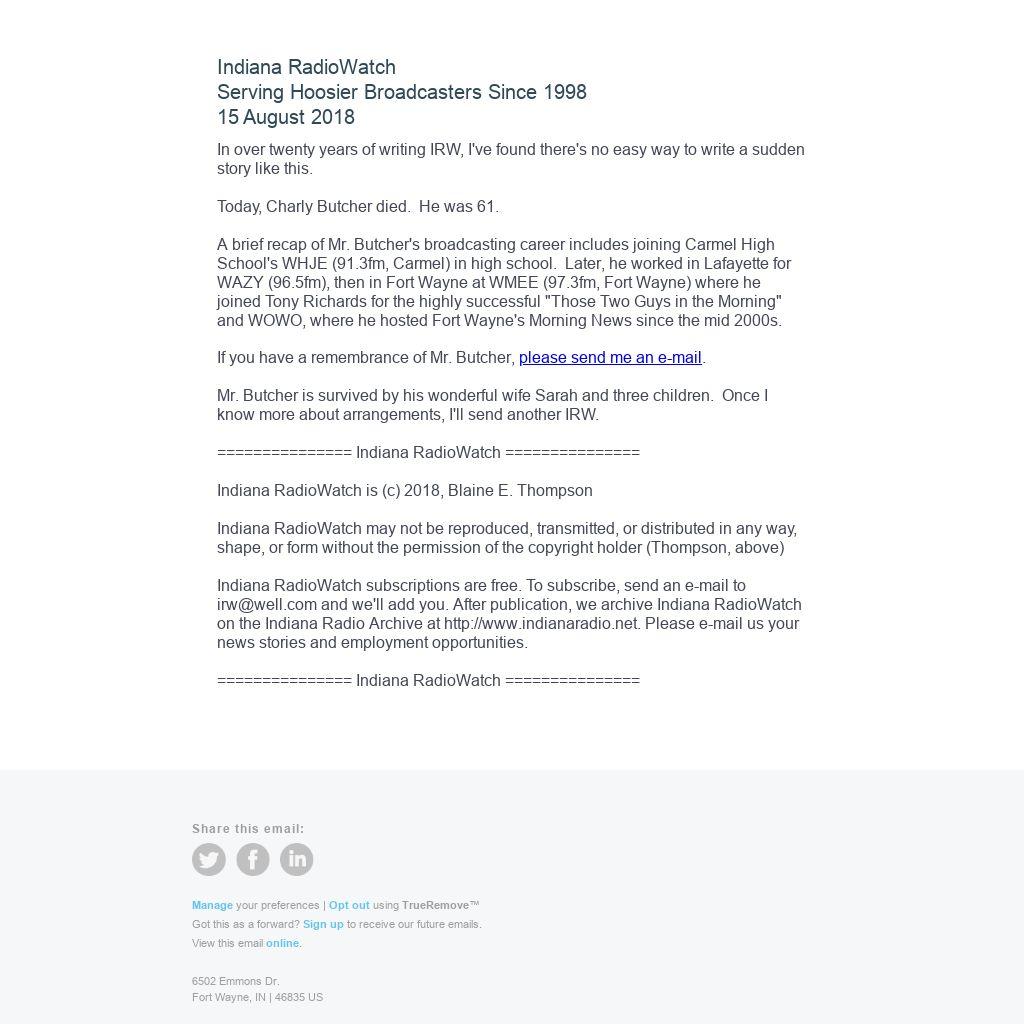 Indiana RadioWatch subscriptions are free. To subscribe, send an e-mail to irw@well.com and we'll add you. After publication, we archive Indiana RadioWatch on the Indiana Radio Archive at http://www.indianaradio.net. Please e-mail us your news stories and employment opportunities.