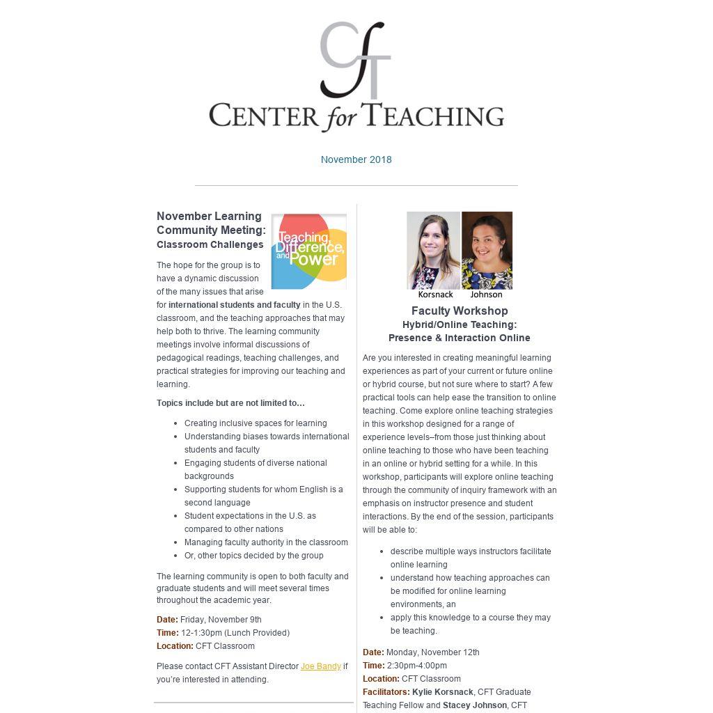 | November Learning Community Meeting: Classroom Challenges The hope for the group is to have a dynamic discussion of the many issues that arise for international students and faculty in the U.S. classroom, and the teaching approaches that may help both to thrive. The learning community meetings involve informal discussions of pedagogical readings, teaching challenges, and practical strategies for improving our teaching and learning. Topics include but are not limited to… - Creating inclusive spaces for learning