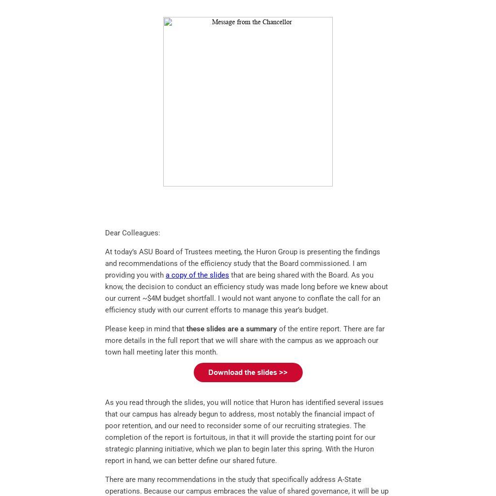 At today’s ASU Board of Trustees meeting, the Huron Group is presenting the findings and recommendations of the efficiency study that the Board commissioned. I am providing you with a copy of the slides that are being shared with the Board. As you know, the decision to conduct an efficiency study was made long before we knew about our current ~$4M budget shortfall. I would not want anyone to conflate the call for an efficiency study with our current efforts to manage this year’s budget.