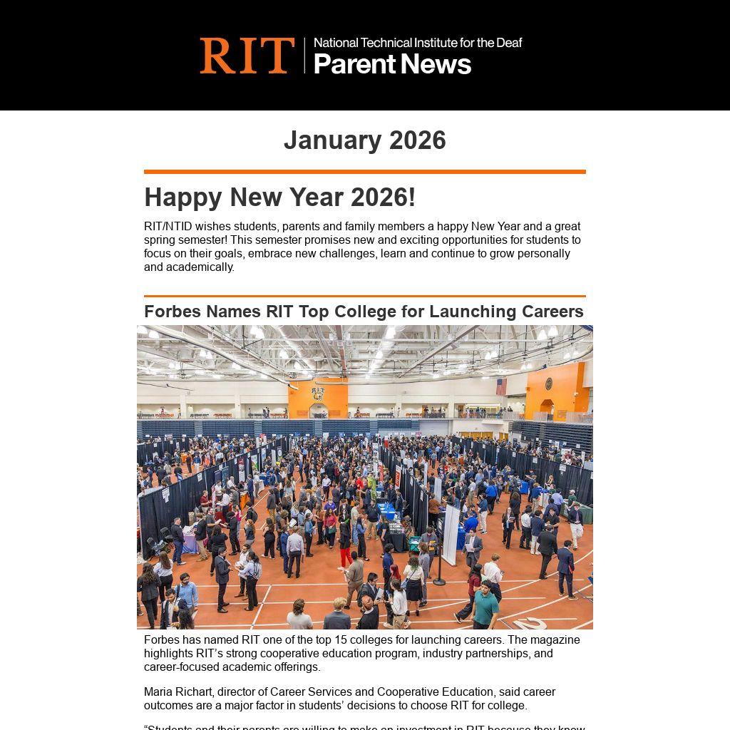 RIT/NTID wishes students, parents and family members a happy New Year and a great spring semester! This semester promises new and exciting opportunities for students to focus on their goals, embrace new challenges, learn and continue to grow personally and academically.