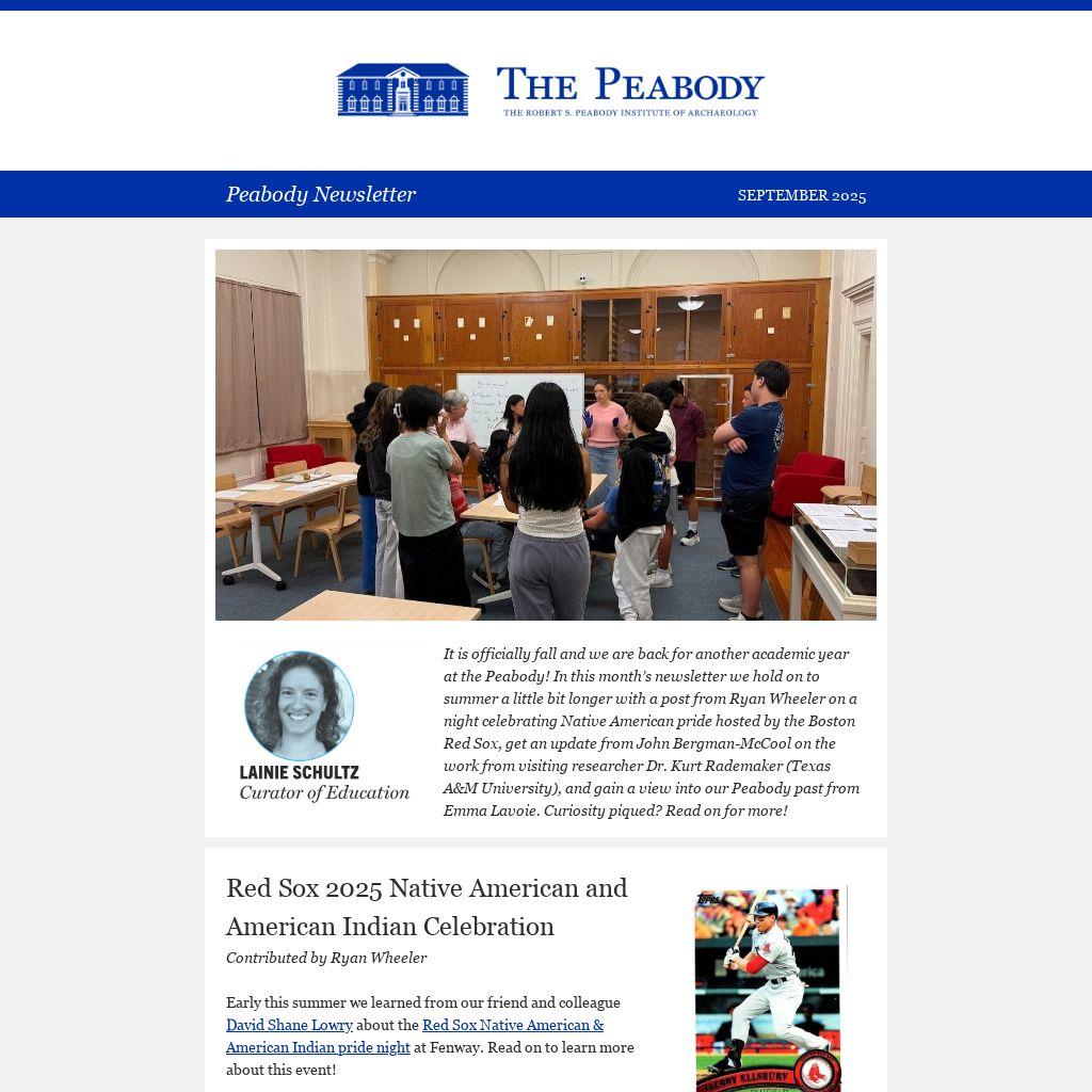 It is officially fall and we are back for another academic year at the Peabody! In this month’s newsletter we hold on to summer a little bit longer with a post from Ryan Wheeler on a night celebrating Native American pride hosted by the Boston Red Sox, get an update from John Bergman-McCool on the work from visiting researcher Dr. Kurt Rademaker (Texas A&M University), and gain a view into our Peabody past from Emma Lavoie. Curiosity piqued? Read on for more!