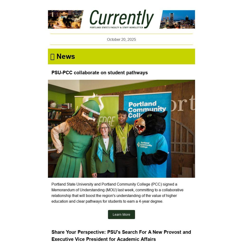 CURRENTLY is a weekly newsletter for the employees of Portland State University, published by University Communications. News items, events and accolades should be sent to currently@pdx.edu. Deadline is noon, the Tuesday before publication. See the Currently website for submission guidelines and schedule.