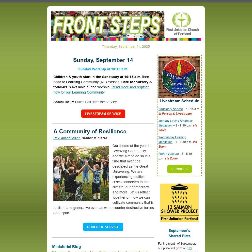We’re proud to launch Hospitality with Heart & Hands at First Unitarian Portland, a team devoted to weaving community by serving with love and care. Learn more here in this week's Ministerial Blog. Supporting events, welcoming guests, assisting with outreach, and sharing cleanup duties, this team helps weave a welcoming and loving fabric where everyone feels at home. Join Heart & Hands Hospitality and become a vital thread in our congregation’s tapestry. Sign up here.Â