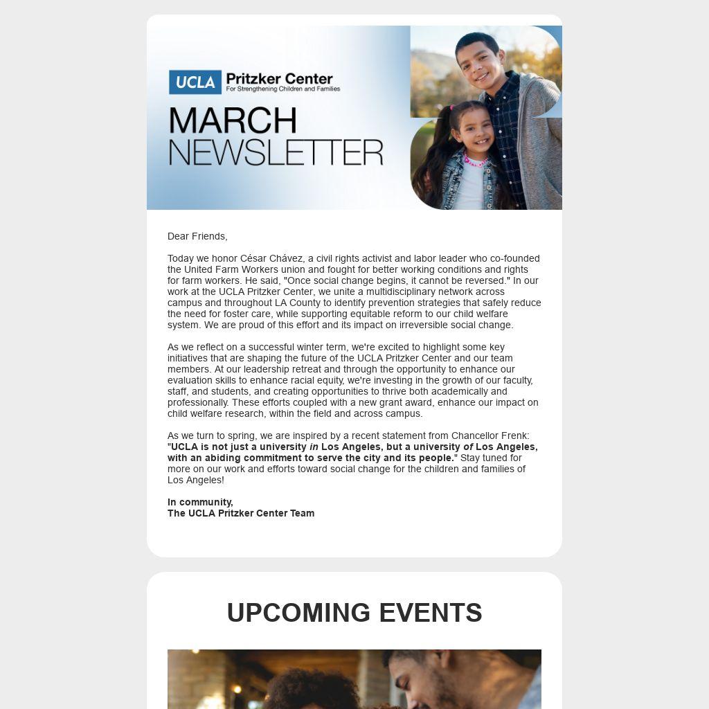 As we turn to spring, we are inspired by a recent statement from Chancellor Frenk: "UCLA is not just a university in Los Angeles, but a university of Los Angeles, with an abiding commitment to serve the city and its people." Stay tuned for more on our work and efforts toward social change for the children and families of Los Angeles!