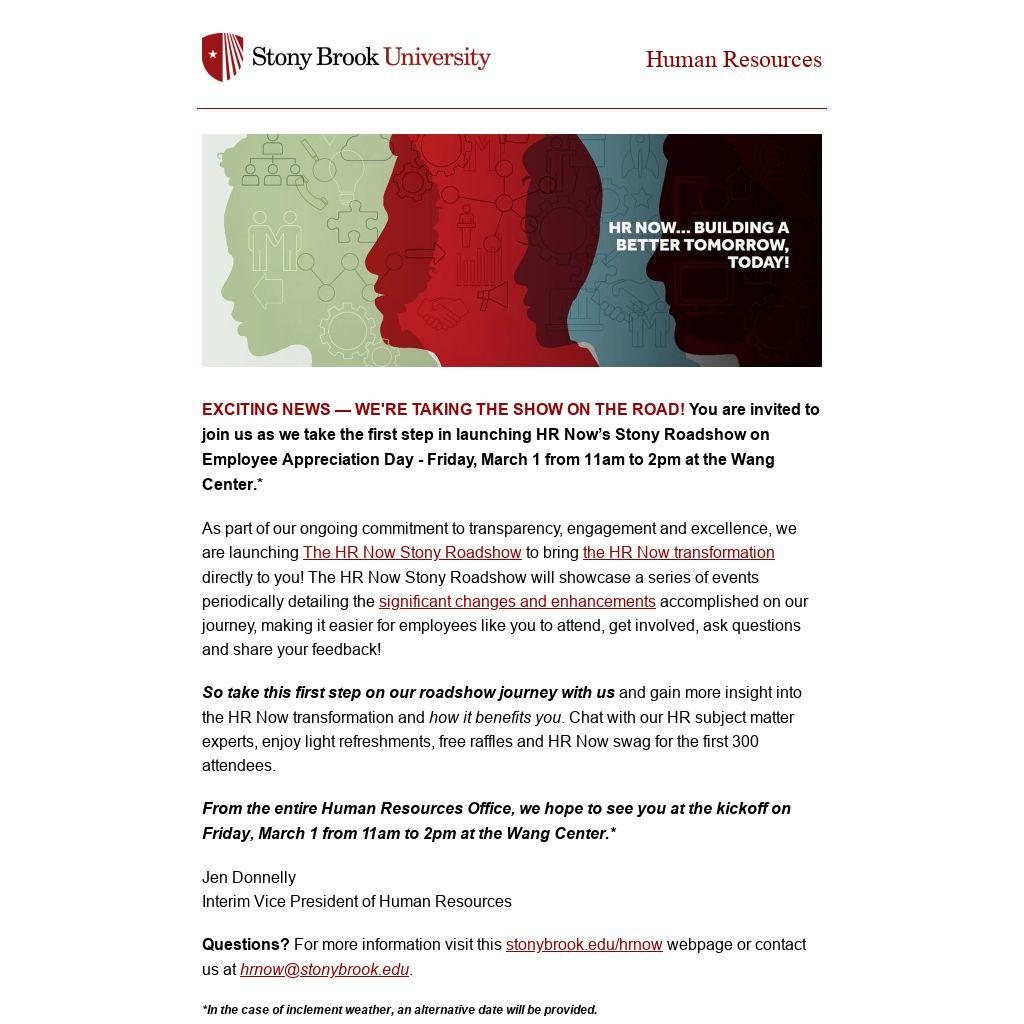 EXCITING NEWS — WE'RE TAKING THE SHOW ON THE ROAD! You are invited to join us as we take the first step in launching HR Now’s Stony Roadshow on Employee Appreciation Day - Friday, March 1 from 11am to 2pm at the Wang Center.*