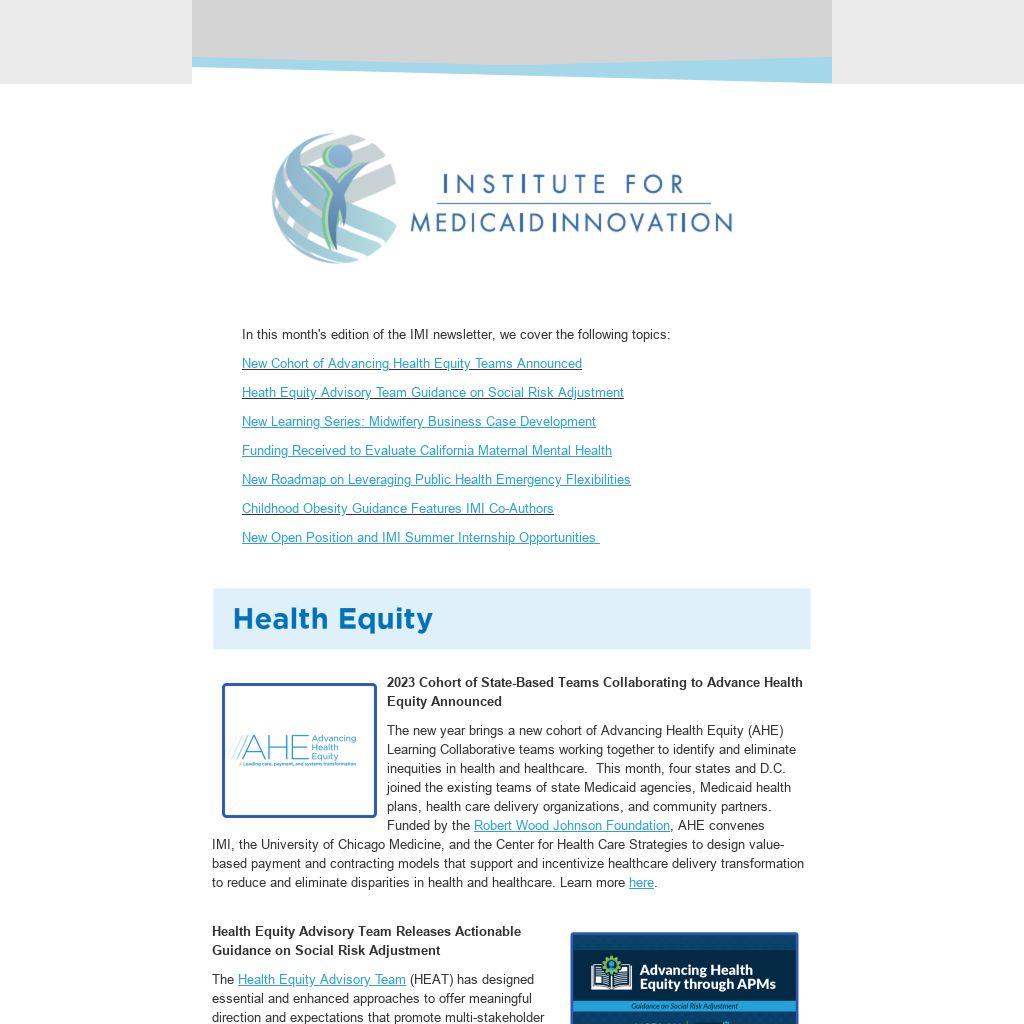 The Institute for Medicaid Innovation (IMI) is a 501(c)3 national nonprofit, nonpartisan research and policy organization focused on providing evidence of innovative solutions that address important clinical, research, and policy issues in Medicaid through multi-stakeholder engagement, research, data analysis, education, learning collaboratives, quality improvement initiatives, and dissemination and implementation activities. IMI is not a membership or trade association and is funded exclusively through research grants and contracts.