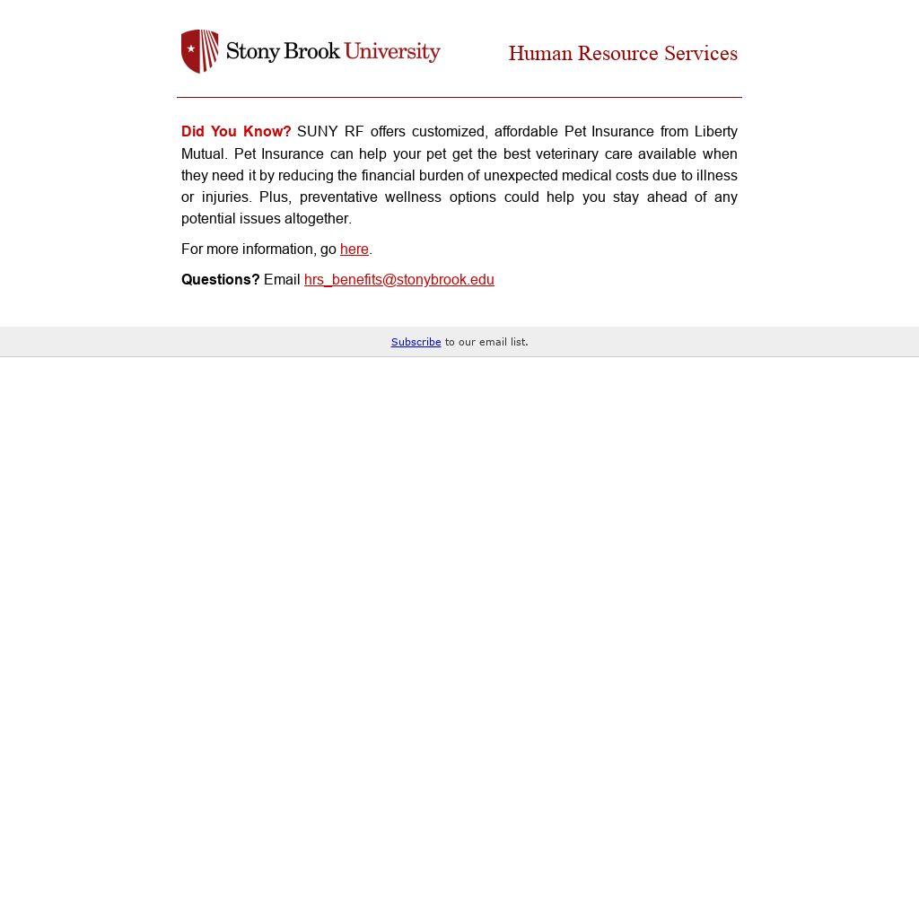 Did You Know? SUNY RF offers customized, affordable Pet Insurance from Liberty Mutual. Pet Insurance can help your pet get the best veterinary care available when they need it by reducing the financial burden of unexpected medical costs due to illness or injuries. Plus, preventative wellness options could help you stay ahead of any potential issues altogether.