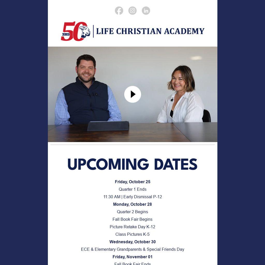 We are excited to announce the launch of new school-level resource pages, designed to provide families with more in-depth details specific to their child’s school experience. Whether your child is in Lower School, Upper School, or part of our Early Childhood Education program, these pages will offer tailored updates, events, and key resources. We hope these pages enhance communication and keep you connected with all that’s happening at Life Christian Academy. Click on the images below to explore.