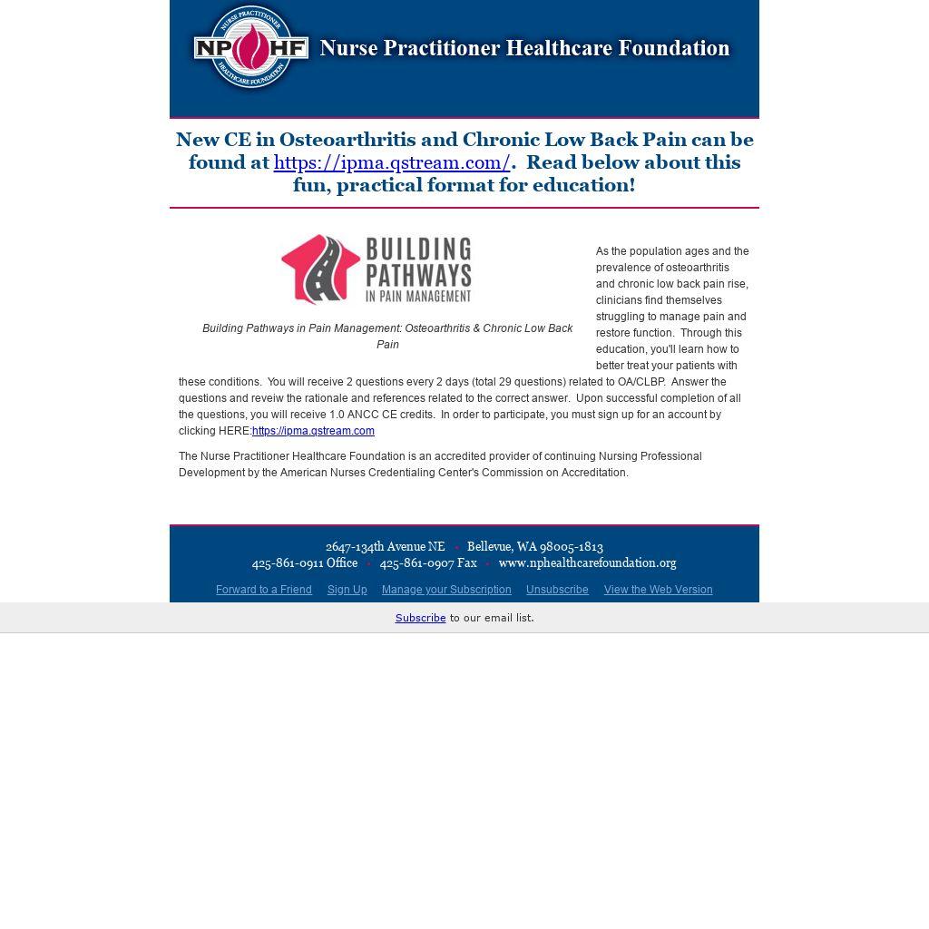 As the population ages and the prevalence of osteoarthritis and chronic low back pain rise, clinicians find themselves struggling to manage pain and restore function. Through this education, you'll learn how to better treat your patients with these conditions. You will receive 2 questions every 2 days (total 29 questions) related to OA/CLBP. Answer the questions and reveiw the rationale and references related to the correct answer. Upon successful completion of all the questions, you will receive 1.0 ANCC CE credits. In order to participate, you must sign up for an account by clicking HERE: