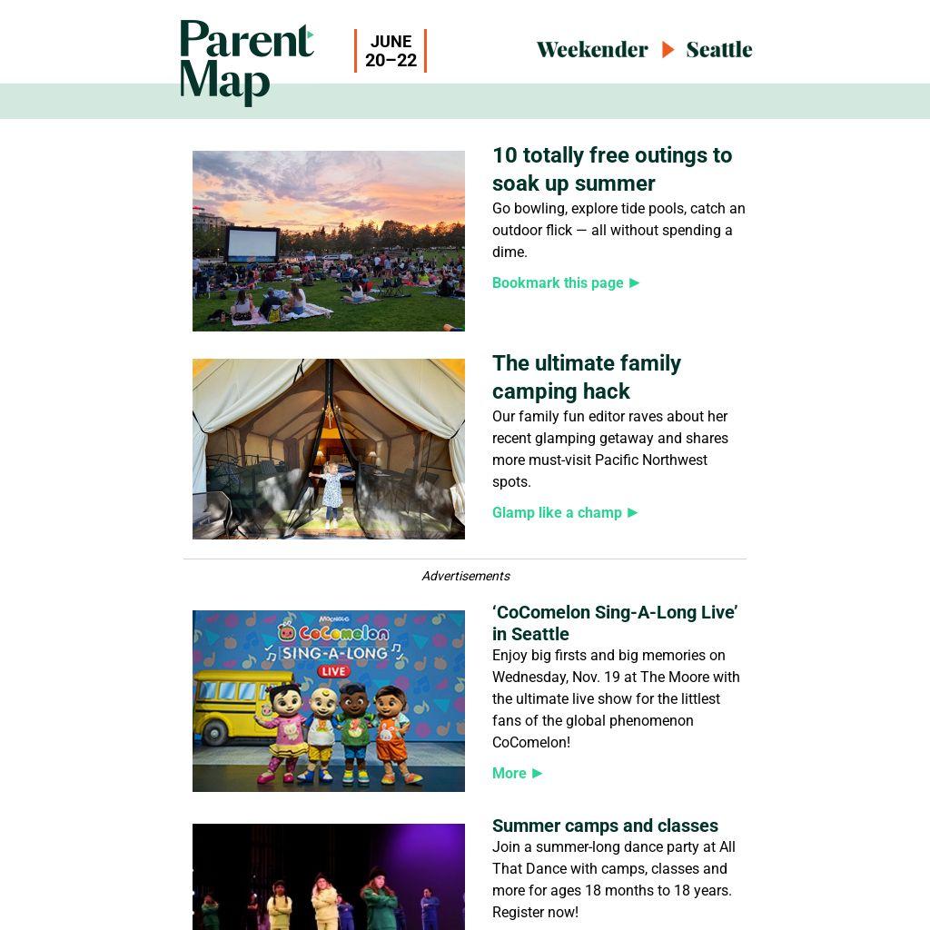 Summer is finally here, families! I donāt know about you, but Iām ready to celebrate, starting with these exciting family activities that donāt cost a thing. Travel is also top of mind now that school is finally out. Our family fun editorās favorite elevated camping experiences are definitely on my radar. Of course, thereās always our top 10 weekend events to provide inspiration, too ā kickoff Seafair and Juneteenth, or score free pizza.Ā