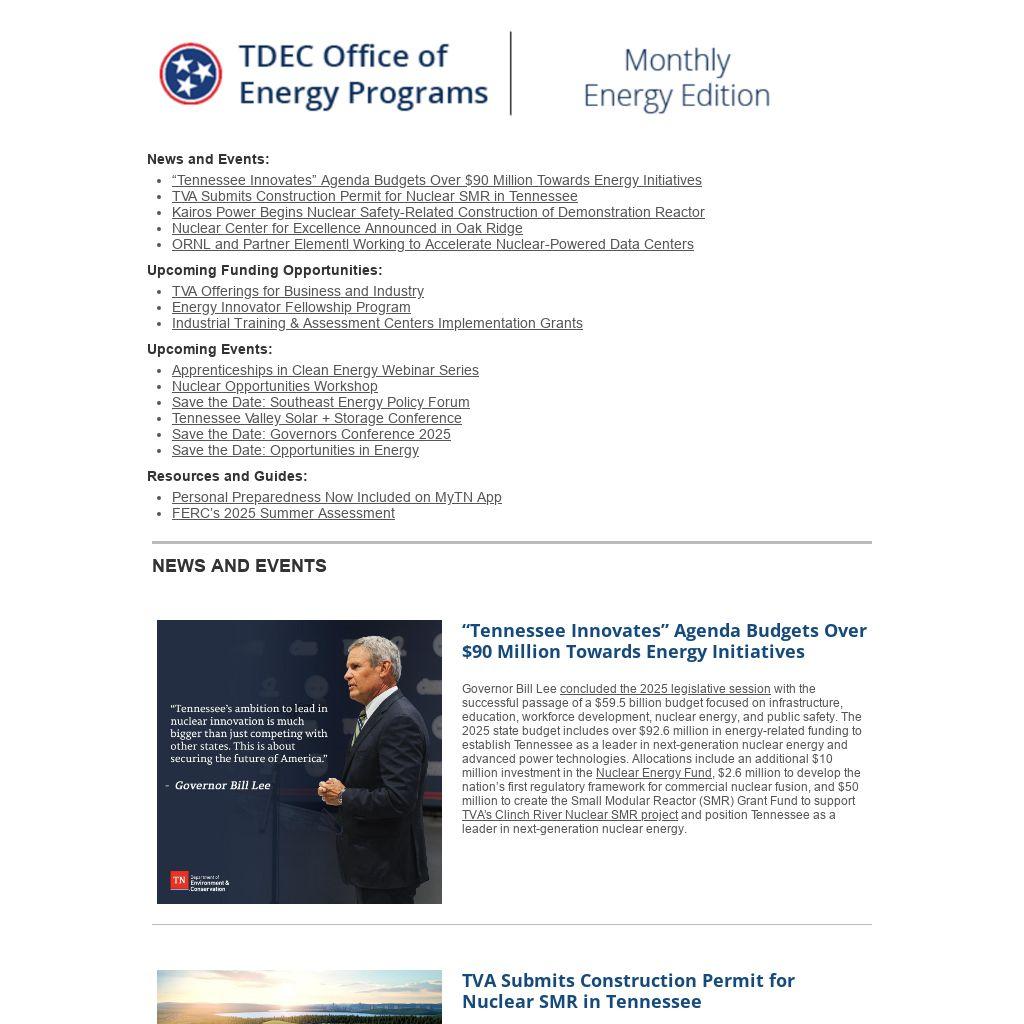 Governor Bill Lee concluded the 2025 legislative session with the successful passage of a $59.5 billion budget focused on infrastructure, education, workforce development, nuclear energy, and public safety. The 2025 state budget includes over $92.6 million in energy-related funding to establish Tennessee as a leader in next-generation nuclear energy and advanced power technologies. Allocations include an additional $10 million investment in the Nuclear Energy Fund, $2.6 million to develop the nation’s first regulatory framework for commercial nuclear fusion, and $50 million to create the Small Modular Reactor (SMR) Grant Fund to support TVA’s Clinch River Nuclear SMR project and position Tennessee as a leader in next-generation nuclear energy.
