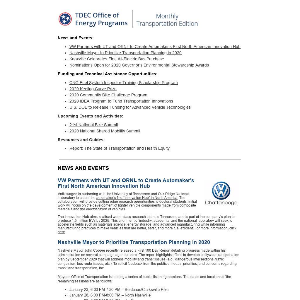 The use of alternative fuels, advanced vehicle technologies, or other sustainable transportation projects could be eligible for an award under several categories, including Clean Air, Energy and Renewable Resources, or Agriculture and Forestry. Any individual, business, organization, educational institution, or agency is eligible for nomination, provided it is located in Tennessee and the project was completed during the 2019 calendar year. A panel of judges will select award recipients based on criteria including level of project or program completion, innovation, and public education. The deadline for nominations is March 31, and winners will be announced in May. Contact Kathy Glapa at (615) 253-8780 or GESA.Awards@tn.gov with any questions.