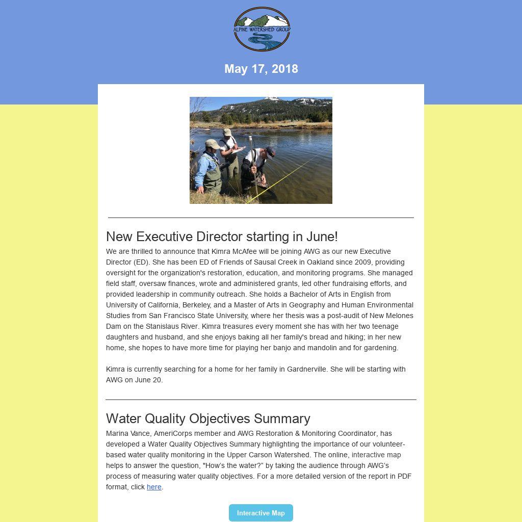 We are thrilled to announce that Kimra McAfee will be joining AWG as our new Executive Director (ED). She has been ED of Friends of Sausal Creek in Oakland since 2009, providing oversight for the organization's restoration, education, and monitoring programs. She managed field staff, oversaw finances, wrote and administered grants, led other fundraising efforts, and provided leadership in community outreach. She holds a Bachelor of Arts in English from University of California, Berkeley, and a Master of Arts in Geography and Human Environmental Studies from San Francisco State University, where her thesis was a post-audit of New Melones Dam on the Stanislaus River. Kimra treasures every moment she has with her two teenage daughters and husband, and she enjoys baking all her family's bread and hiking; in her new home, she hopes to have more time for playing her banjo and mandolin and for gardening.