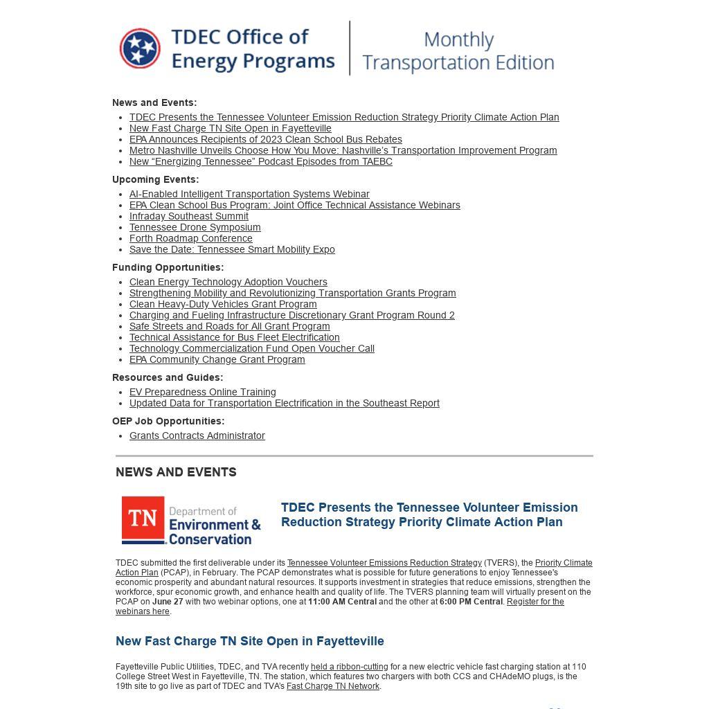 TDEC submitted the first deliverable under its Tennessee Volunteer Emissions Reduction Strategy (TVERS), the Priority Climate Action Plan (PCAP), in February. The PCAP demonstrates what is possible for future generations to enjoy Tennessee's economic prosperity and abundant natural resources. It supports investment in strategies that reduce emissions, strengthen the workforce, spur economic growth, and enhance health and quality of life. The TVERS planning team will virtually present on the PCAP on June 27 with two webinar options, one at 11:00 AM Central and the other at 6:00 PM Central. Register for the webinars here.