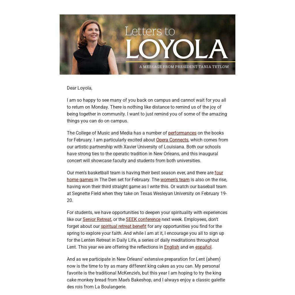 For students, we have opportunities to deepen your spirituality with experiences like our Senior Retreat, or the SEEK conference next week. Employees, don’t forget about our spiritual retreat benefit for any opportunities you find for the spring to explore your faith. And while I am at it, I encourage you all to sign up for the Lenten Retreat in Daily Life, a series of daily meditations throughout Lent. This year we are offering the reflections in English and en español.