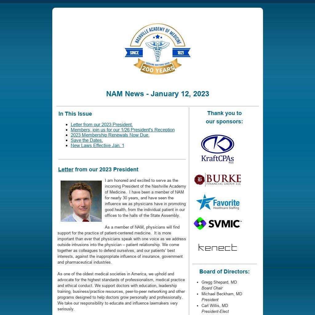 I am honored and excited to serve as the incoming President of the Nashville Academy of Medicine. I have been a member of NAM for nearly 30 years, and have seen the influence we as physicians have in promoting good health, from the individual patient in our offices to the halls of the State Assembly.