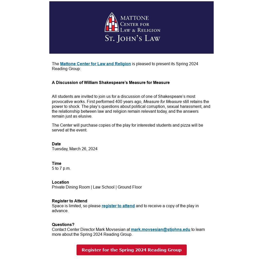 Contact Center Director Mark Movsesian at mark.movsesian@stjohns.edu to learn more about the Spring 2024 Reading Group.