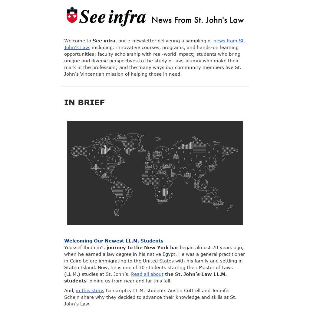 | Welcome to See infra, our e-newsletter delivering a sampling of news from St. John’s Law, including: innovative courses, programs, and hands-on learning opportunities; faculty scholarship with real-world impact; students who bring unique and diverse perspectives to the study of law; alumni who make their mark in the profession; and the many ways our community members live St. John's Vincentian mission of helping those in need.