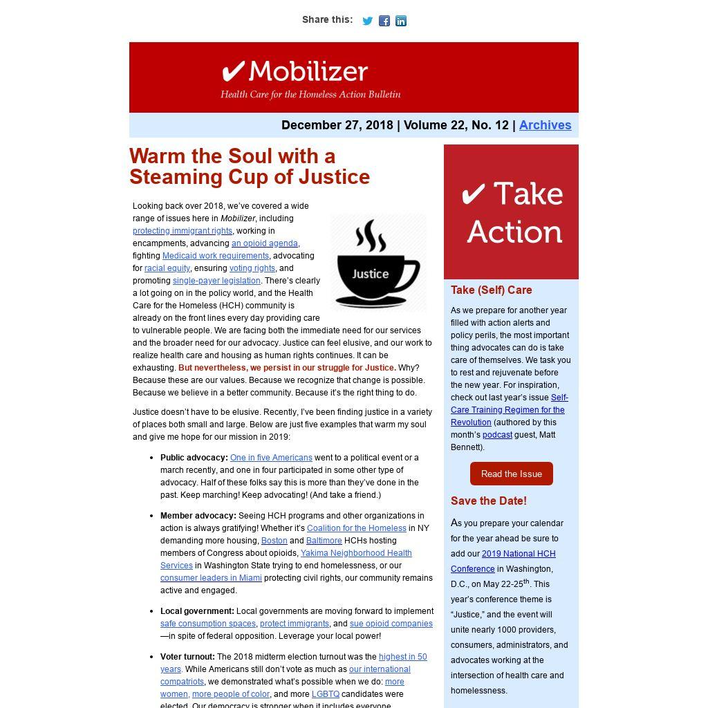 Looking back over 2018, we’ve covered a wide range of issues here in Mobilizer, including protecting immigrant rights, working in encampments, advancing an opioid agenda, fighting Medicaid work requirements, advocating for racial equity, ensuring voting rights, and promoting single-payer legislation. There’s clearly a lot going on in the policy world, and the Health Care for the Homeless (HCH) community is already on the front lines every day providing care to vulnerable people. We are facing both the immediate need for our services and the broader need for our advocacy. Justice can feel elusive, and our work to realize health care and housing as human rights continues. It can be exhausting. But nevertheless, we persist in our struggle for Justice. Why? Because these are our values. Because we recognize that change is possible. Because we believe in a better community. Because it’s the right thing to do.