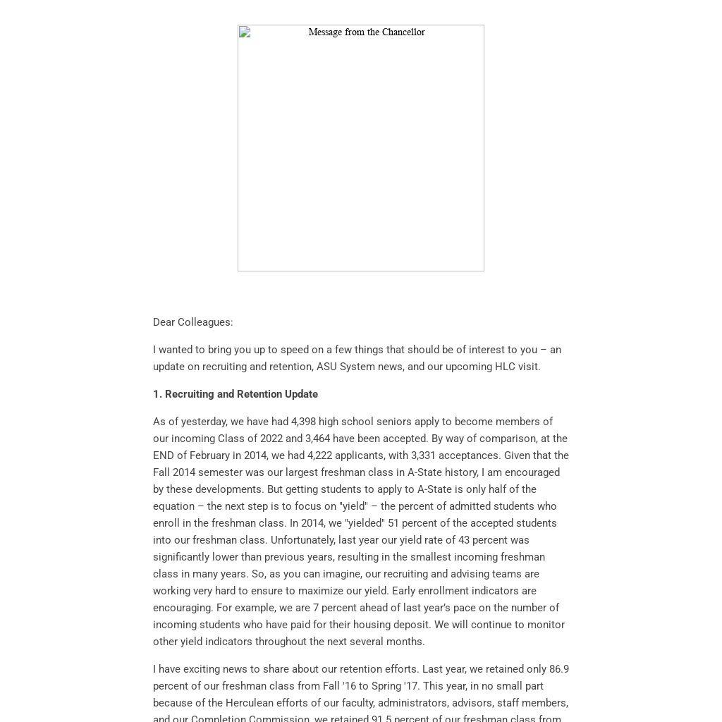 I wanted to bring you up to speed on a few things that should be of interest to you – an update on recruiting and retention, ASU System news, and our upcoming HLC visit.