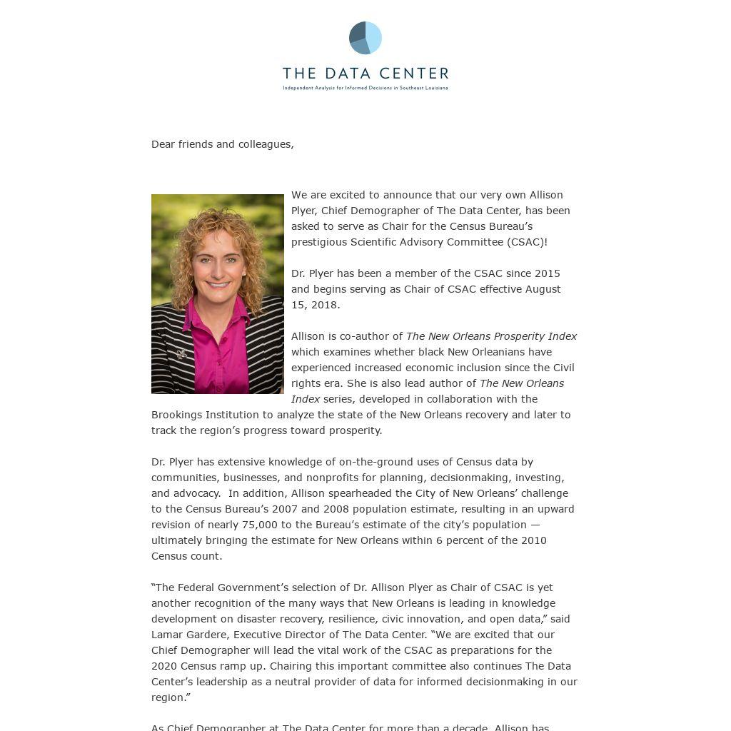 We are excited to announce that our very own Allison Plyer, Chief Demographer of The Data Center, has been asked to serve as Chair for the Census Bureau’s prestigious Scientific Advisory Committee (CSAC)!